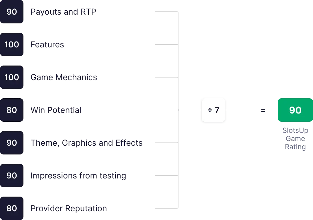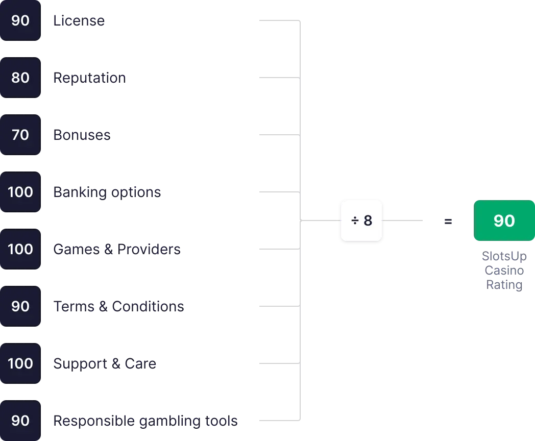 SlotsUp ocena kazina se izračunava na osnovu 8 ključnih metrika, od kojih se svaka ocenjuje od 0 do 100. Ove ocene se sabiraju, prosečavaju i koriste za određivanje konačne ukupne ocene.