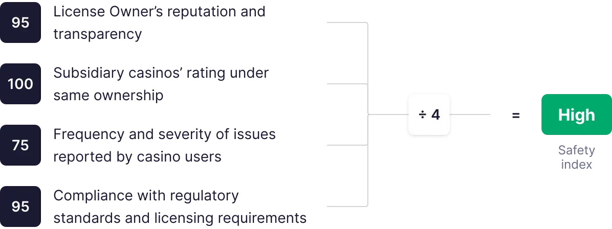 Bezbednost kazina ocenjujemo na osnovu 4 kriterijuma (2 pojedinačna i 2 međusobno povezana), svaki ocenjen od 0 do 100. Ocene se sabiraju, izračunava se prosek, i tako se određuje konačni indeks bezbednosti.