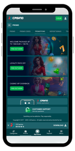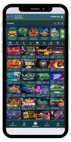 Katalog sadrži više od 6.000 različitih 22casino igara. Format je vrlo zgodan, sa filterima po kolekcijama i dobavljačima. Među kolekcijama igrači mogu pronaći: "22 izbora", "popularno", "rulet", "džekpot Igra", "Baccarat", "Keno", "bonus za kupovinu", "kaskada", "knjiga slotova", "Crash", "Hot", "Nev", "Poker", "Blackjack", "3D Slotovi", "ispadanja i pobede", "Bingo", "Megavais", "Classic Slots", "Cluster", "Hold and Vin.. Postoji i opcija za dodavanje igara u favorite i pregled najnovijih igara.